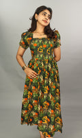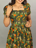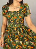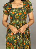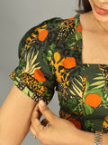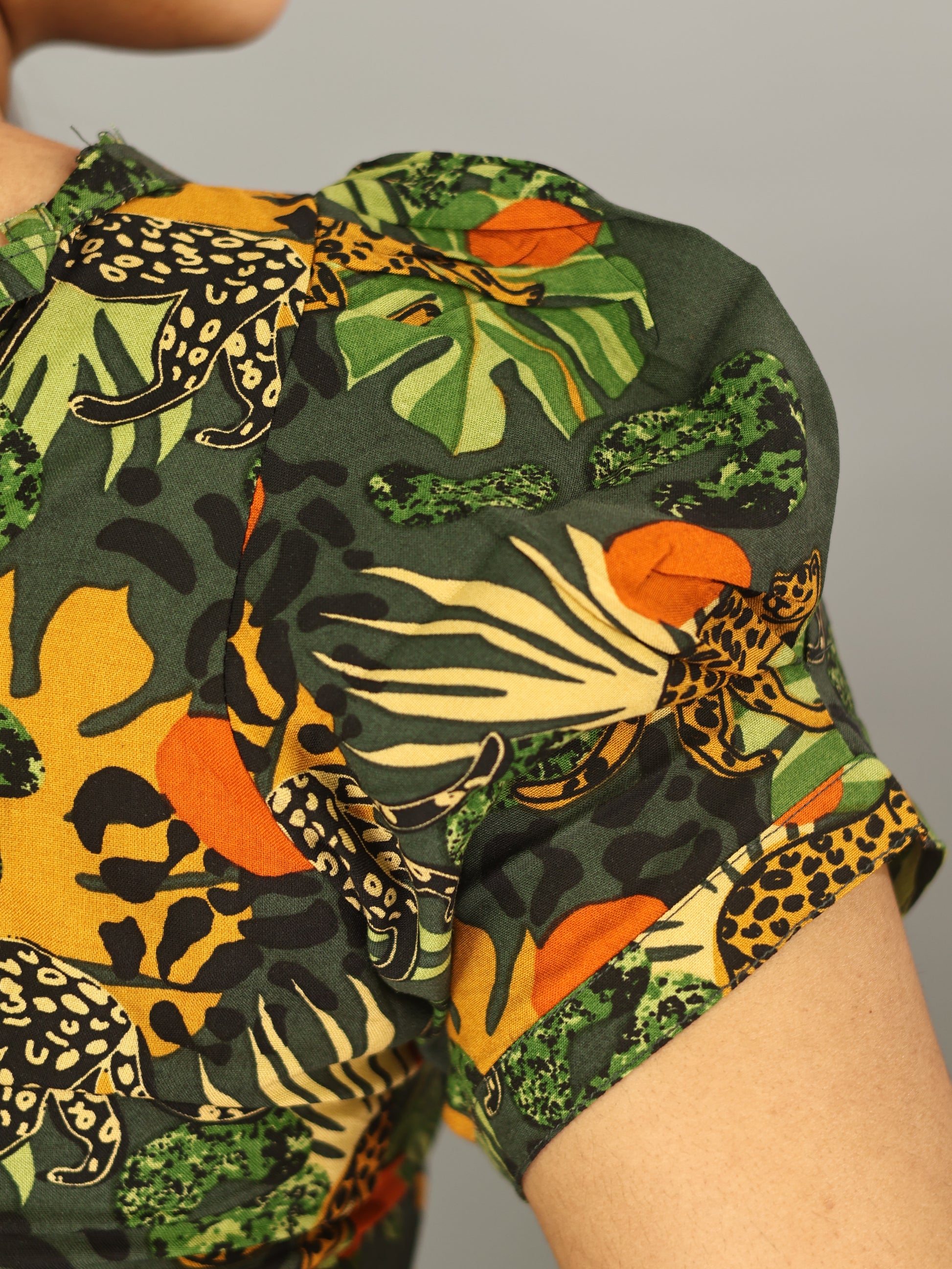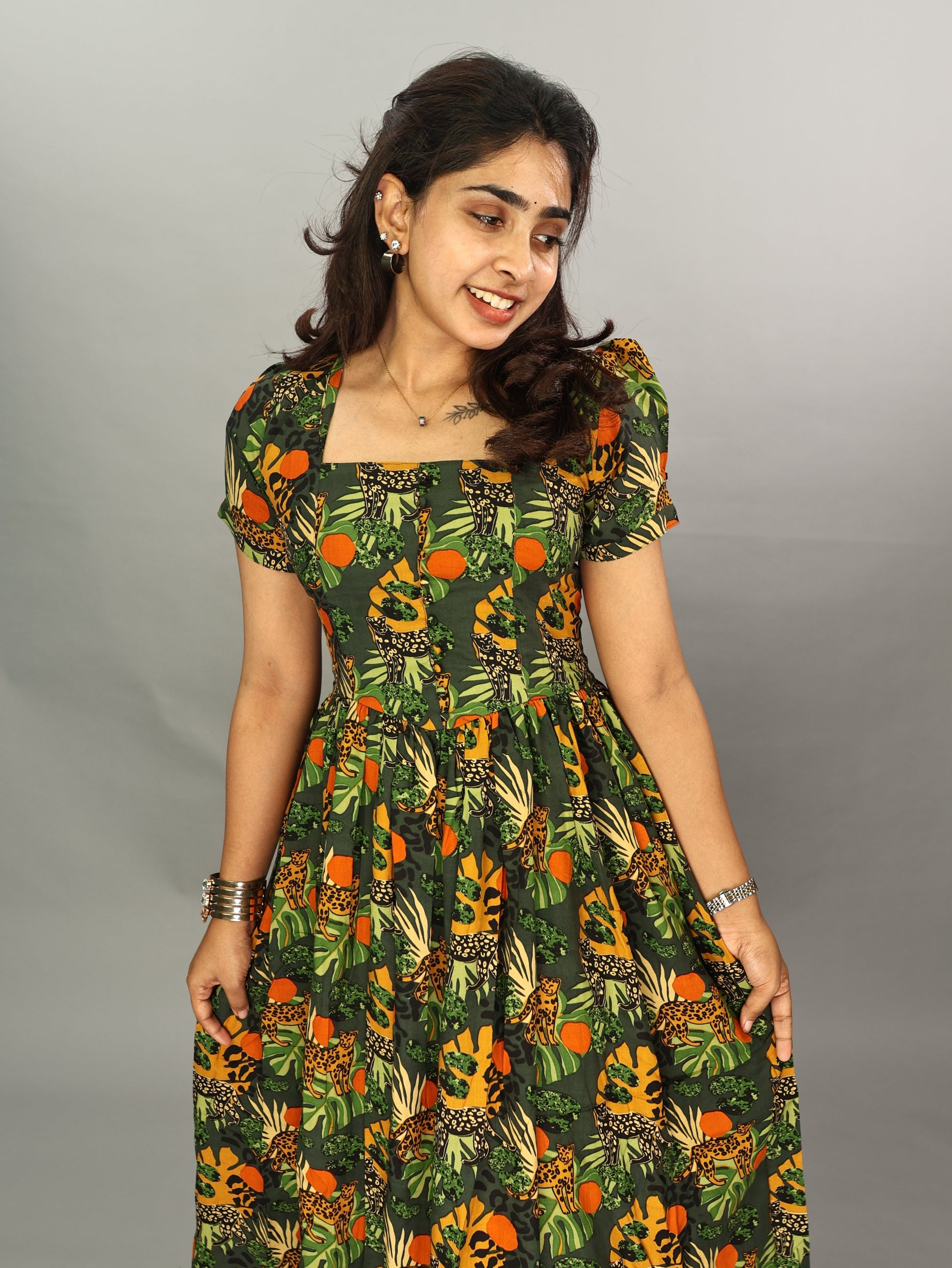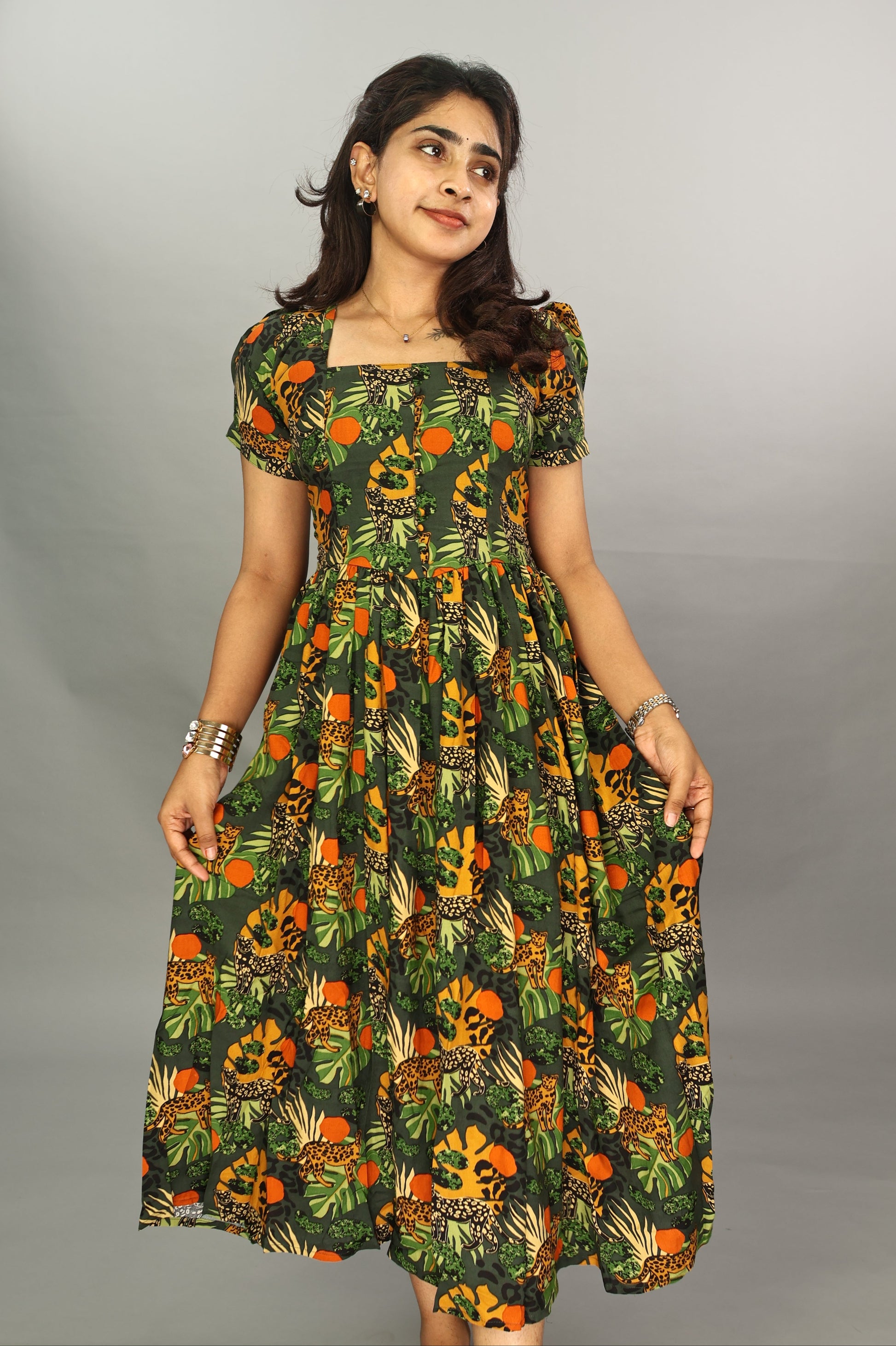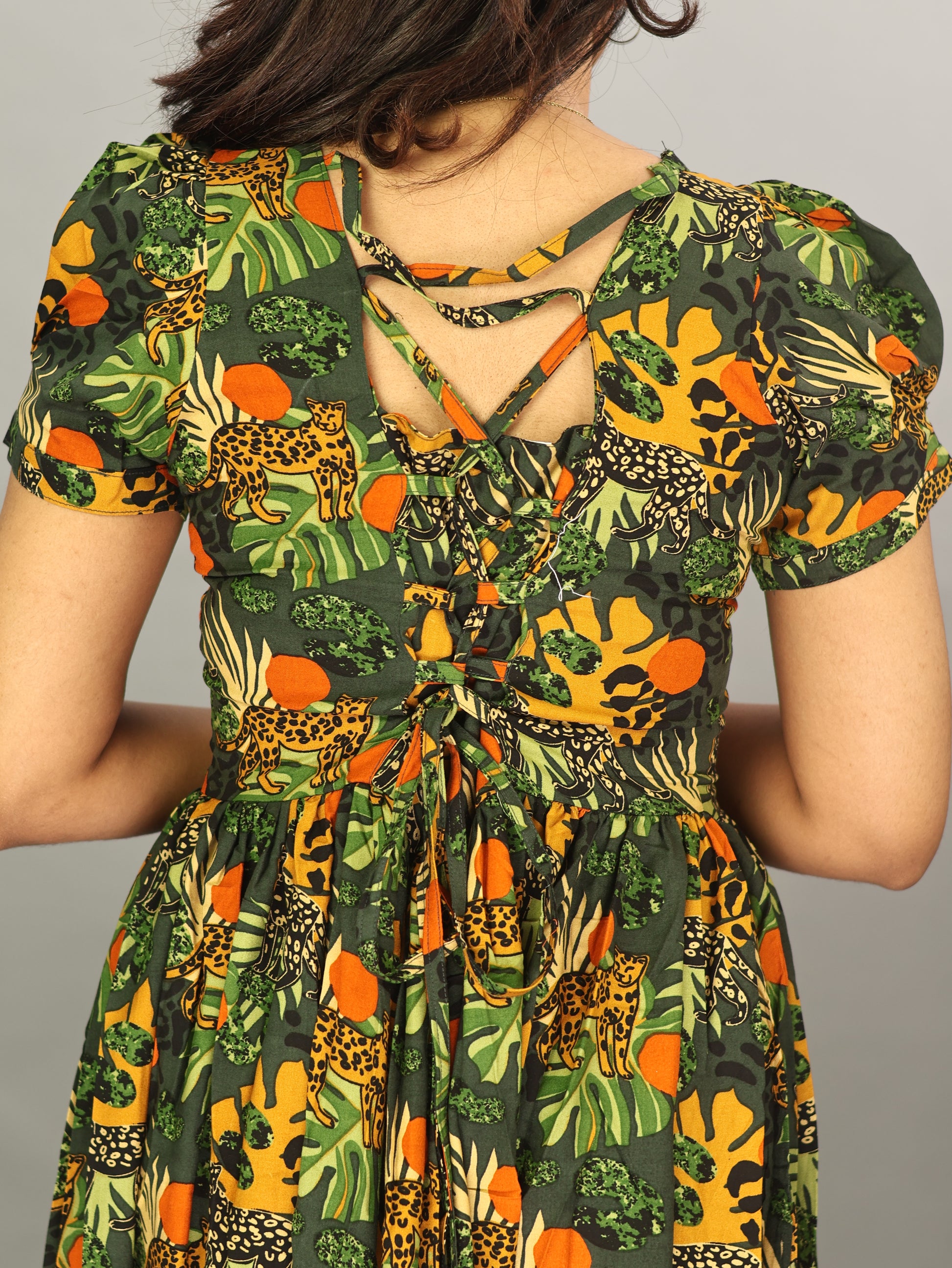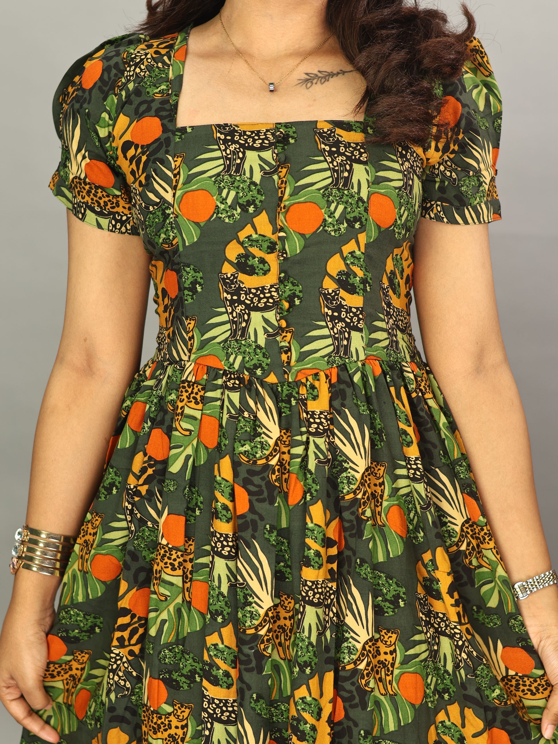 Unleash your wild side with this Wildwood Elegance Maxi Dress. Featuring an exotic tropical and leopard print on a rich green base, this dress is a must-have for nature lovers and fashionistas alike. The square neckline and short puff sleeves enhance its charming appeal, while the lace-up back provides a perfect fit. Whether you're going for a day out, vacation, or a festive gathering, this dress is a standout choice.